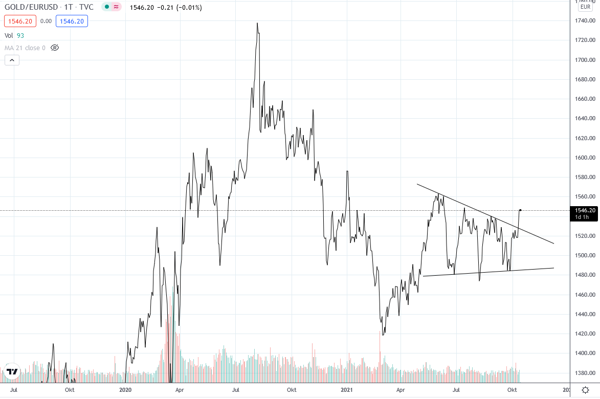 Soll mir Recht sein... nur glaube ich im Moment noch nicht daran. Bisher hängen wir immer noch in der Zone zwischen 1730 - 1830 USD resp. 1470 bis 1550 EUR fest. Ein großer Knall - Evergrande kippt und 10 weitere Konzerne der gleichen Größe & Branche kippen mit - kann uns natürlich nach oben rauskatapultieren, aber das muss auch erst mal passieren.