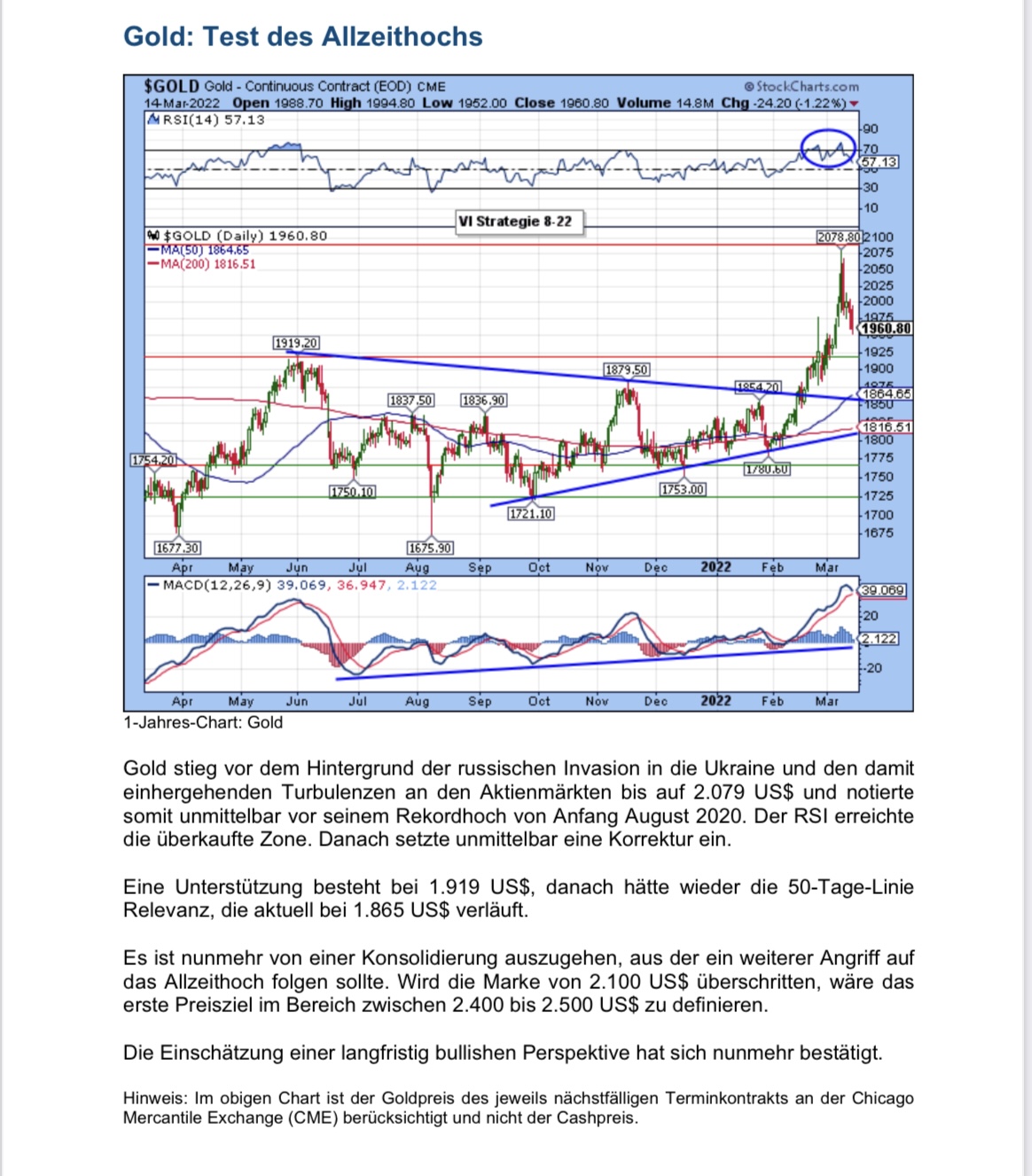 Gold stieg in der Vorwoche in Richtung seines Rekordhochs und verpasste dies lediglich um rund 5 US$. Die nachfolgende Korrektur ist sozusagen eine perfekte Reaktion des Marktes: Kein Fehlausbruch, sondern Gewinnmitnahmen standen zunächst im Vordergrund. Damit ist der Goldmarkt bereinigt. Folgt ein neuer Rekord, eröffnet sich auf charttechnischer Basis ein Preisziel in Richtung 2.400 bis 2.500 US$.