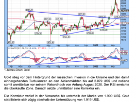Die Rally an den Aktienmärkten resultierte in erster Linie auf die zuvor überverkaufte Lage, zudem spiegelten kurzfristig orientierte Stimmungsindikatoren einen hohen Pessimismus der Anleger. Somit handelte es sich um eine normale Gegenbewegung innerhalb der unverändert intakten Korrekturen. Ein weiterer positiver Impuls folgte am Freitag, als die Hoffnung die Runde machte, dass es zu einem Waffenstillstand in der Ukraine kommen würde. Alles in allem entstand in der Vorwoche der Eindruck, als wolle die Wall Street wieder zur (gewohnt bullishen) Tagesordnung zurückkehren.