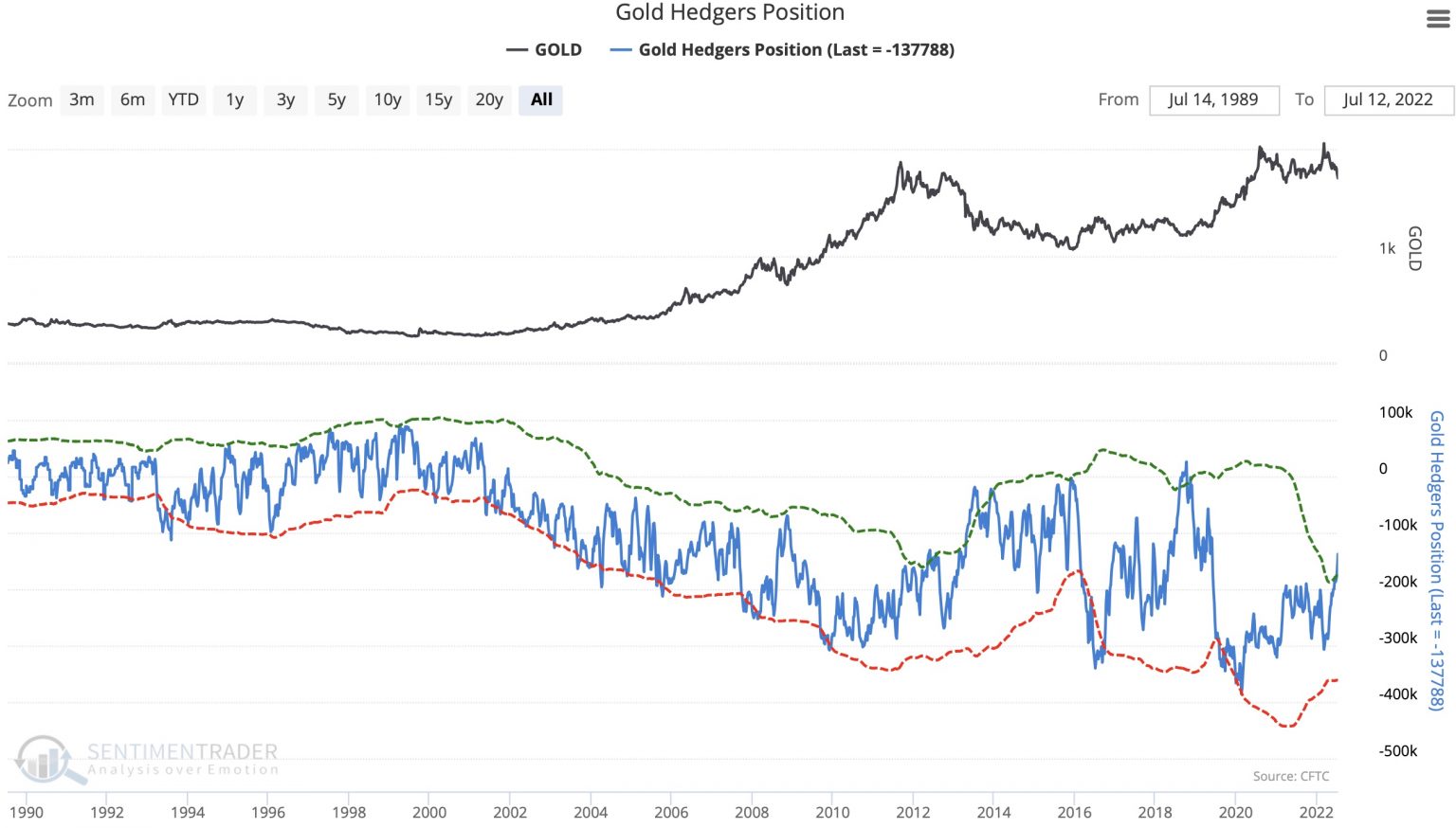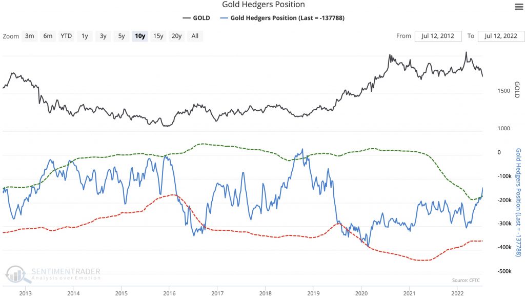 10-Jahres-Chart zeigt Kommerzielle Unternehmen sichern Gold-Short-Positionen nach dem jüngsten Abwärtsbewegung auf dem Goldmarkt
