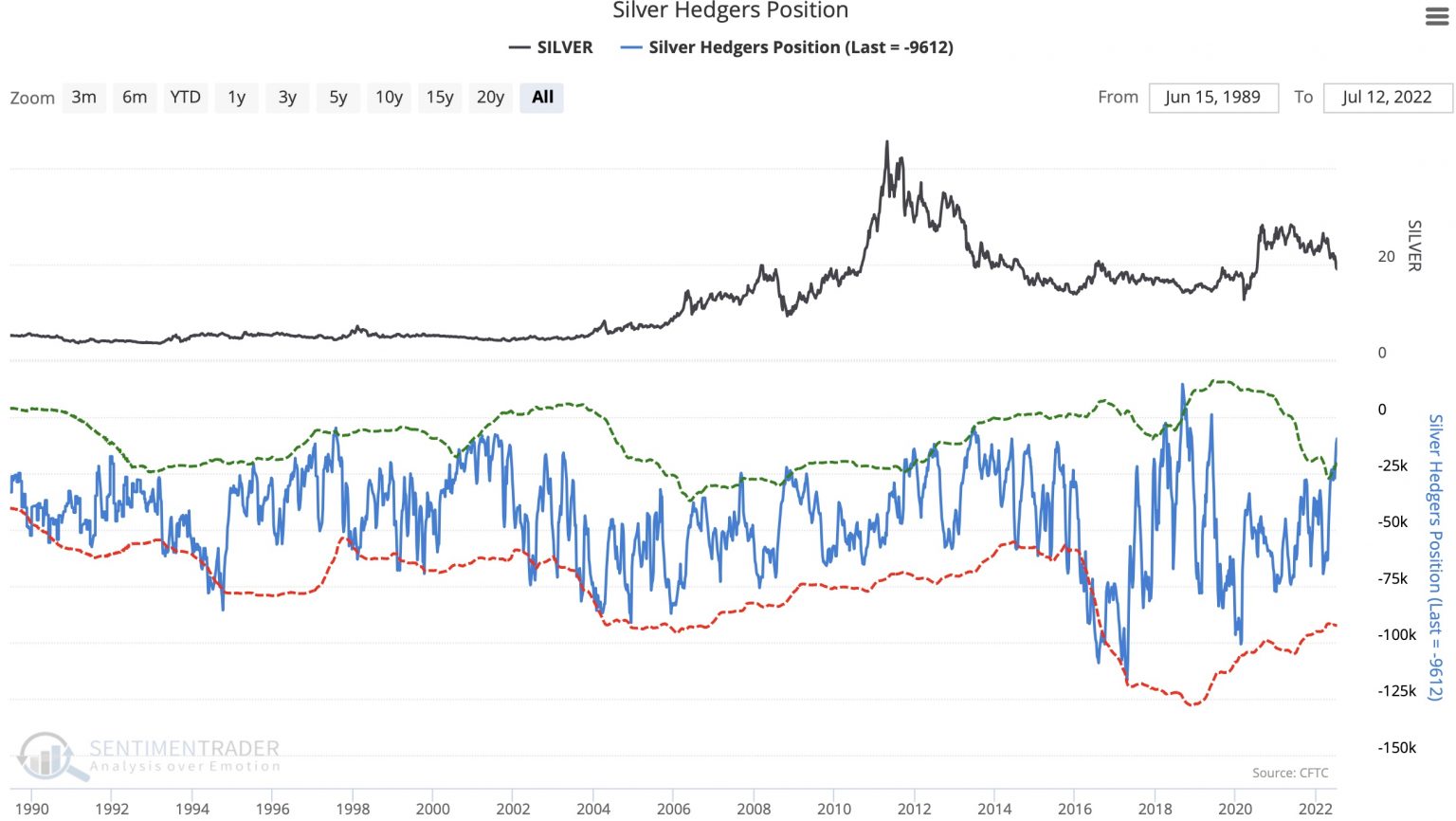Im Folgenden wird ein Blick auf die Positionierung kommerzieller Händler auf dem Silbermarkt über mehrere Jahrzehnte hinweg geworfen. Es steht außer Frage, dass das Setup des Silbermarktes aus historischer Sicht derzeit extrem bullisch ist.