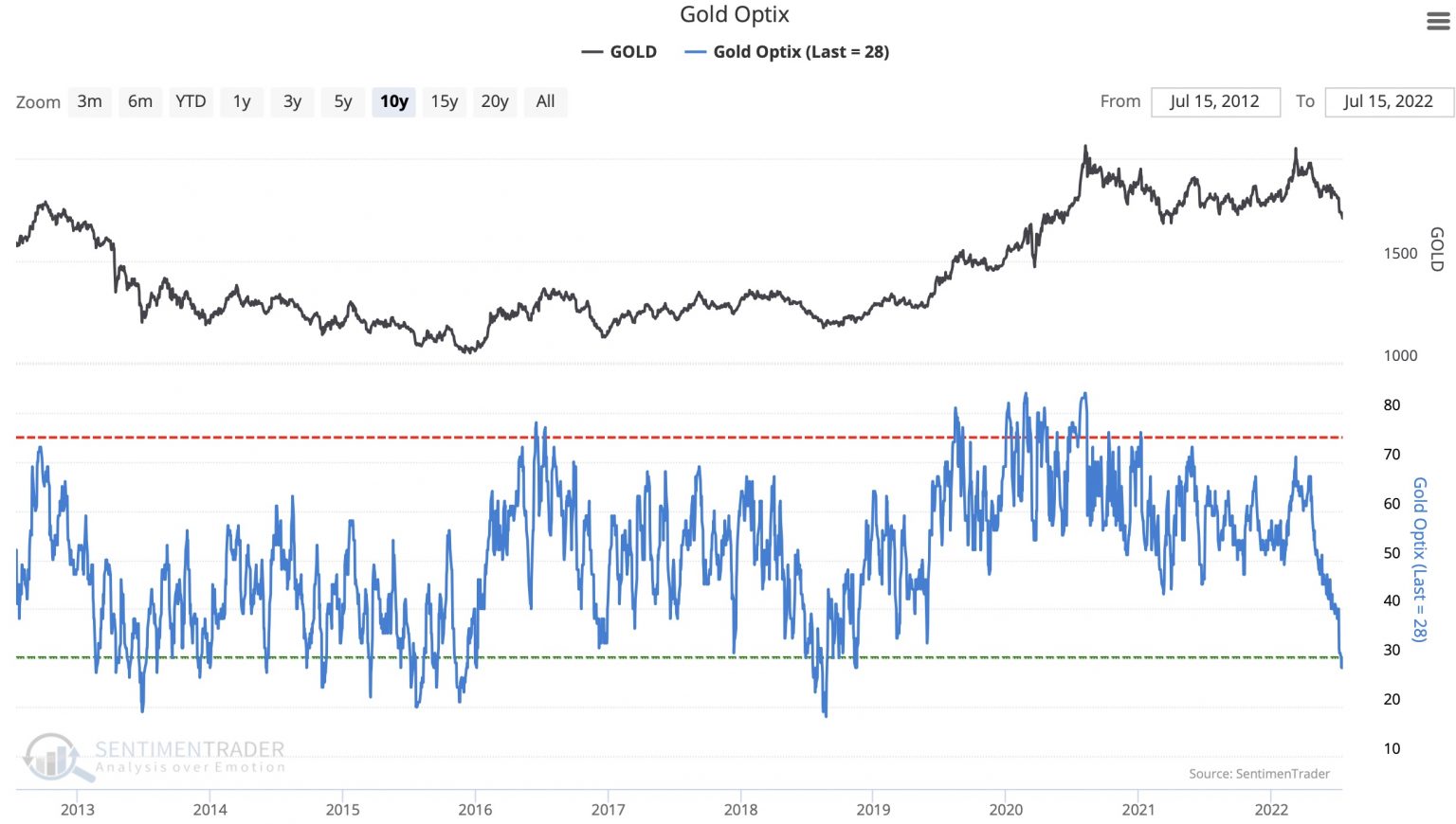 Die negative Stimmung auf dem Goldmarkt deutet nun darauf hin das der Markt in gewissem Maße kapituliert. Aus einer konträren Perspektive ist dies ein positives Zeichen, insbesondere jetzt, da die negative Stimmung ein "extremes" Niveau erreicht hat.
