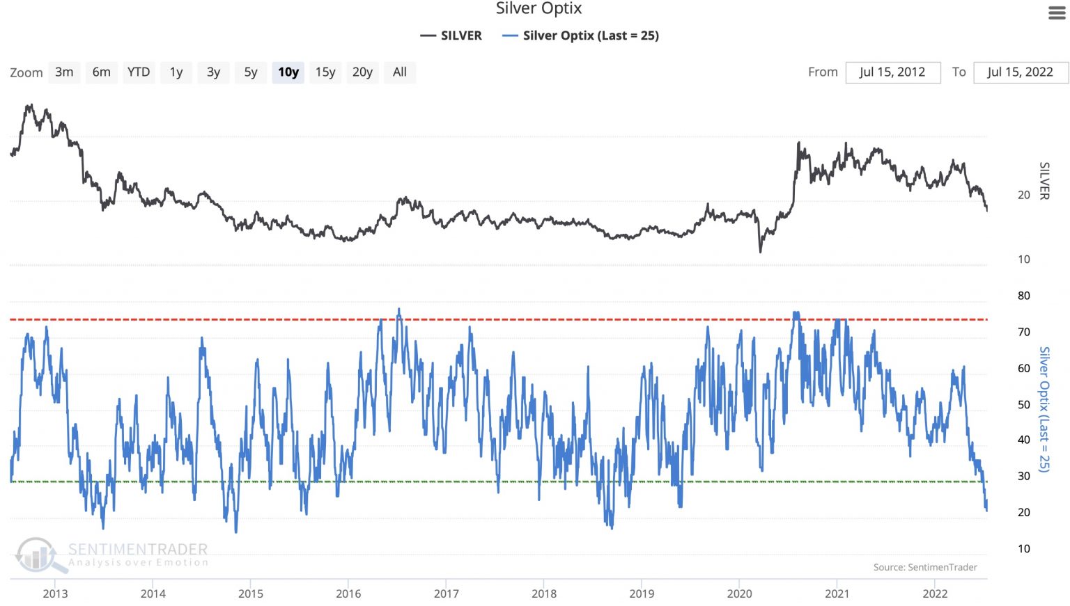 Langfristiger Chart zeigt die negative Stimmung auf dem Silbermarkt hat nun eines der "extremsten" Niveaus der Geschichte erreicht