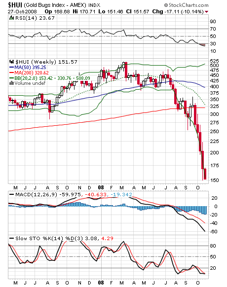 • kurzfristige Prognosen abzugeben ist derzeit fast unmöglich....Fakt ist, dass z.B. der HUI inzwischen bei seiner langfristigen Unterstützung angekommen ist (150 Punkte), die hat am Freitag gehalten und die hat gestern gehalten, scheinbar kann nicht mehr genug Abwärtsdruck erzeugt werden um den HUI darunter zu drücken, es scheint, dass die schwachen Hände endgültig draussen sind....Als Denkanstoß noch folgende Schlussfolgerung....der Index gilt grundsätzlich als stark überkauft, wenn er sich um 40-50% von der 200 Tage linie nach oben entfernt...das gleich gilt natürlich auch für das Gegenteil...derzeit sind wir 60% nach unten von der 200 Tage linie entfernt....eine maßlos irrationale Unterbewertung....eine derartige absolute Übertreibungsphse gab es beim HUI noch nie....weder nach oben noch nach unten...vom Gefühl her war es das mit den Abgaben....ob der HUI jetzt gleich wieder nach oben startet oder ob es eine Seitwärtsbewegung gibt vermag ich nicht zu sagen...ich glaube aber eher an den turn arond