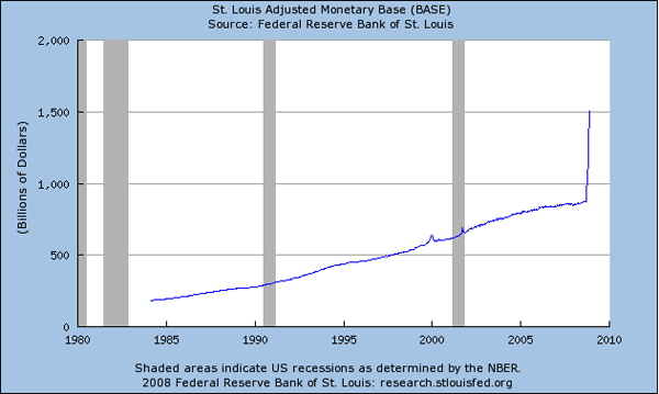 This is the US money base - the total of all currency and reserves of commercial banks in the central bank itself. It's the narrowest form of monetary aggregate (but getting fatter fast). Banks create loans from base money, so in theory this recent expansion should turn up in broader monetary aggregates in the future.....