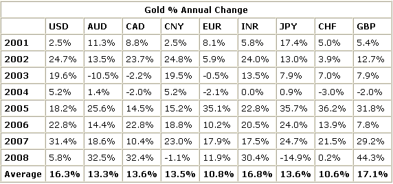 Now that the global financial meltdown has got up a head of steam, investors are hard pressed to find any investment that has performed well over the last ten years as consistently as gold. The chart below outlines this performance and appears here courtesy of James Turk’s GoldMoney.com.