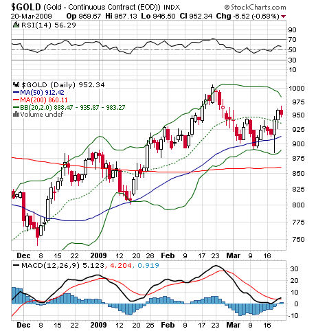 Wenn man mit jeder x-beliebigen Bankaktie 15% und mehr an einem einzigen Tag machen kann und der Dow seinen stärksten Tagesanstieg seit 5 Monaten erlebt, wird selbstverständlich umgeschichtet und die Goldgewinne der letzten Tage werden mitgenommen. Die Aktienmärkte stehen an einem bedeutenden Wendepunkt: entweder ist das heutige Geschehen der Beginn einer zügigen technischen Erholung, die die Shortseller auf dem falschen Fusse erwischt und rasche Gewinne ermöglicht, oder doch nur ein vergeblicher Versuch, Geithners Plänen erstmal einen Vertrauensbonus zu verschaffen. Die Psychologie der nächsten Tage wird hier den Weg weisen. Bald schon könnte wieder die ernüchternde Aussicht auf die schwachen Unternehmensgewinne die Oberhand gewinnen, doch dass die Bankwerte erstmal einen kräftigen Schub bekommen würden, war abzusehen - also haben sich alle dementsprechend verhalten. Mit den meisten Bankaktien konnte man in den letzten Wochen satte Gewinne machen. Heute waren sie narrensichere Selbstläufer.