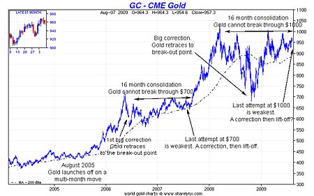 Many will remember the big move in gold from about $430 to $730 an ounce between August 2005 and May 2006. There then followed a frustrating sixteen-month period, which began with a violent correction that took gold back to the point it had broken out from. Gold then edged its way up, making higher lows and repeatedly trying and failing to break through $700. It made four attempts and couldn't get past $680. The fourth attempt was the least convincing of all...."