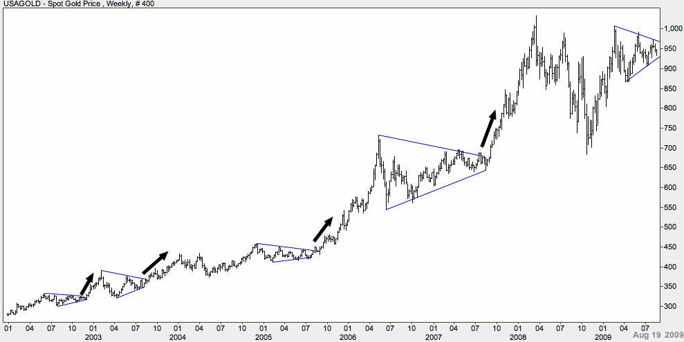 The last time we had such a nicely formed triangle in the gold market was during the 2006/2007 consolidative period. When the breakout eventually came, it resulted in a 50% gain (more than $300)...."