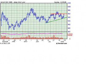 Gold began the last week with considerable downside pressure as bearish news filtered through the markets. There was a massive short position from the bullion banks, JP Morgan and HSBC :evil: and a report from the World Gold Council. According to the report gold demand fell to a six-year low in the second quarter as recession curbed buying by jewelers and electronics producers. The report also stated that global consumption fell 8.6 percent to 719.5 metric tons from a year earlier. That’s the lowest level since the first quarter of 2003. Jewellery demand declined 22 percent and electronics, the biggest industrial use for gold, slid 26 percent. Rozanna Wozniak, investment research manager at the council said, “Tough economic conditions have impacted jewelry and industrial demand. Investment demand provided a cushion and we do expect that to continue.”