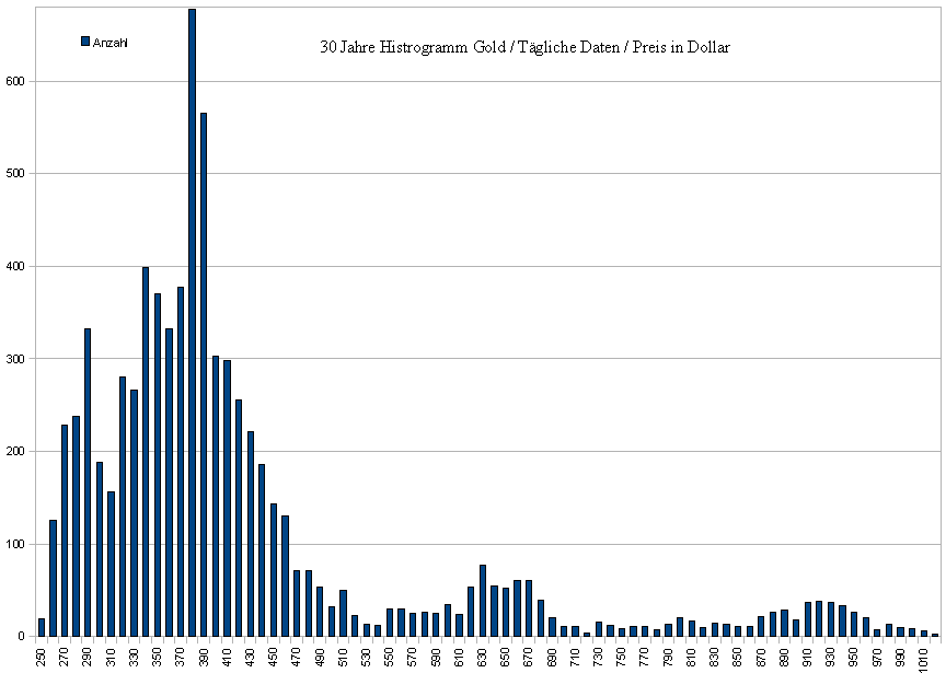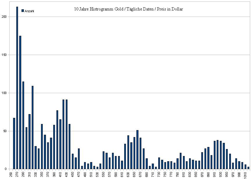 Hier als Bonbon noch ein Histogram vom Goldpreis 2001-2008 (tägliche Daten; Dollar)