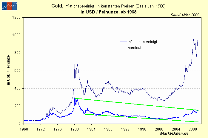 Was kommt raus, wenn man den Goldpreis inflationsbereinigt darstellt und einen Trend einzeichnet? Die Kaufkraft ist in dem Chart dann normalisiert . Kommt auch "Mitte" 500$ raus: