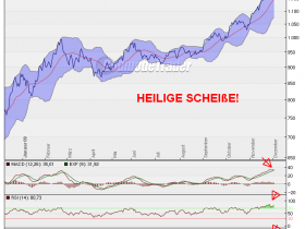 RSI, MACD, Slow Stochastic und Bollinger Bänder sind alle im überbewerteten Zustand (sowohl im kurzfristigen, als auch langfristigen chart) - d.h. der Goldpreis ist so heißgelaufen wie lange nicht mehr - und kann locker um über 200-300$ fallen