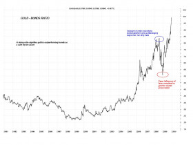 "...The following is one of the more important charts I will post this week. It details the Gold/Bond ratio which is basically a comparison of the TWO generally regarded “SAFE HAVEN” assets – Gold and US Treasury Bonds...."