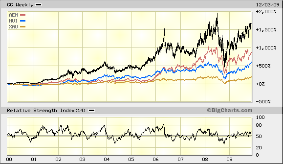Schön dieser Hinweis, auratico.Daß mit einigen Aktien weitaus höhere Gewinne möglich gewesen wären, zeigt ein Vergleich zweier Gold Bluechips -- Goldcorp und Agnico Eagle -- vs. HUI und XAU.