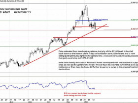 Daß Gold noch einen guten langen Anstieg vor sich hat, ist Goldhardlinern gewiß. Nur die Gegenwart ist unklar. Da helfen --oder auch weniger -- Blicke auf die berühmt / berüchtigten Fibonacci Linien, wie hier im Chart von Trader Dan Norcini. Aber klar, daß diese nicht ohne Seitenblicke auf den Dollar sinnvoll sind.....