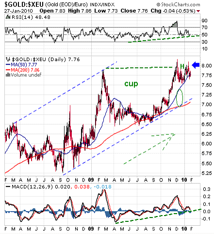 "...Featured is the gold price in Euros. The trend is up and price is now in the process of forming a bullish ‘cup with handle’. A breakout at the blue arrow will be very bullish. The supporting indicators are positive (green lines), and the 50D is in positive alignment with the 200D (green oval), and both are rising....