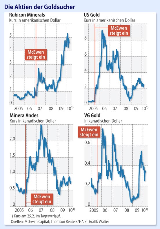 Das Gold ist längst zu seiner Passion geworden. Im Zuge der Entwertung des Papiergeldes werde der Geldcharakter des Goldes wieder deutlicher hervortreten, sagt Rob McEwen voraus. 2000 Dollar werde die Feinunze gegen Ende des laufenden Jahres kosten. 1090 Dollar sind es aktuell. Der Kanadier gehört zu den Männern, auf die man in der Branche achtet. Denn im Unterschied zu vielen anderen hat Rob McEwen mit Gold ein Vermögen gemacht.