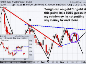 "...All that said the problem I see now on the daily chart is the possibility of the mini Head & Shoulders pattern breaking down. If gold moves any lower then I would expect a sharp pullback. The measured move would equal a pullback to the $104 area on the GLD chart and the $1070 level for spot gold...."