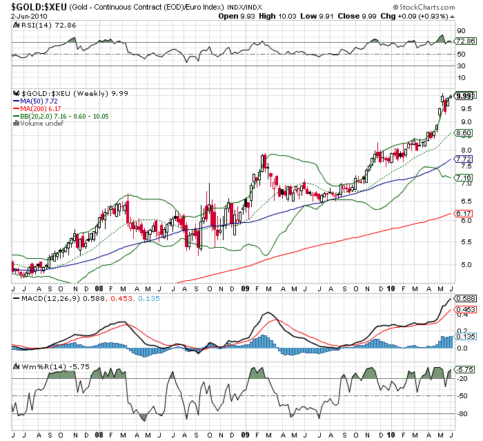 Da ich trotz des Euro-Dilemmas weiterhin davon ausgehe, dass bald die (nächste) Sau , nämlich wieder der US Dollar, durchs Dorf gejagt wird, könnte ich mir vorstellen, dass der Goldpreis in Euro auch bei einem Goldkurs von 1.400 US Dollar knapp unterhalb der 1.000 E-Marke Marke verweilen wird.