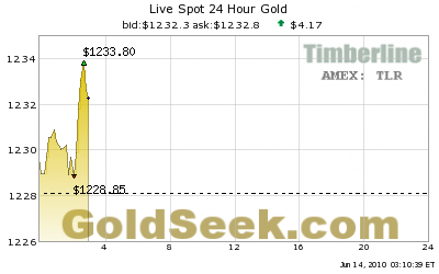 Gold futures for delivery in August fell $15.70, or 1.3 percent, to $1,229.90 an ounce on the Comex in New York today. Yesterday, the metal reached $1,254.50, an all-time high. The price climbed for nine straight years and is up 12 percent in 2010.