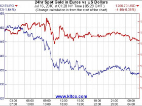 Zum Thema: Dieser Eindruck entsteht, weil die Kitco Charts schlicht falsch sind. Was auf den Kitco Charts "EUR/oz" zu sehen ist, ist nur ein mit dem aktuellen USD/EUR Kurs skalierter USD/oz Chart. Der "echte" EUR/oz chart sieht dem Kitco Chart nichtmal ähnlich (s. Anhang).