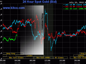 Die Fundamental-Investoren kaufen dauernd und nutzen jeden Preis-Dipp. Rating-Downgrades von Portugal verändern derzeit die Stimmung bei Fundamentalinvestoren nicht: ein Ramschpapierstatus für alle Piigs-Staaten und die Monetisierung der Staatsschulden durch die EZB ist bei den Fundis inzwischen eingepreist. Und genau aus diesem Grund kaufen sie kontinuierlich, aber halt bei Schwächephasen und nicht während eines Preis-Spikes kurz nach der Moodys-Presse-Mitteilung.Am Mittwoch und Donnerstag gab es beim Goldhandel an der Comex – wieder einmal – ungewöhnliche Preisbewegungen. Wie an der Grafik von Kitko.com gut zu erkennen, zeigte der Goldpreis bis zum Ende des Londoner Fixing am Nachmittag eine extreme Schwäche, um an beiden Tagen nach dem Londoner Fixing raketenartig nach oben zu steigen.