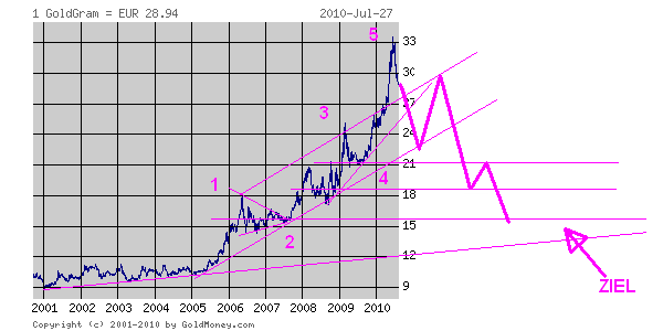 Immer noch werden Goldwetten glattgestellt, die im Zuge der Euroangst eingegangen wurden. Zuerst stieg der Goldpreis wegen schwachem Dollar, der dann folgende Anstieg auf deutlich über $ 1200 verdankte sich dem Griechenlandschock. Wenn der Euro wieder auf 1.35 zurückkommen sollte, dürfte das mittelfristig nichts Gutes für den Goldpreis bedeuten.