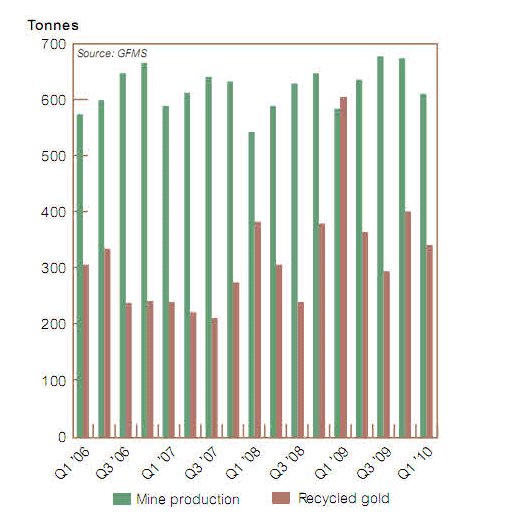 Grund für den Rückgang sei geringeres Recycling im Vergleich zu dem Rekord in den ersten drei Monaten des Jahres 2009 sowie niedrigere Verkäufe aus dem offiziellen Sektor. Das Recycling verzeichnete im ersten Quartal einen Rückgang um 43% und lieferte 343 Tonnen Gold. Eine Rolle spielte zudem das De-Hedging der Produzenten...."