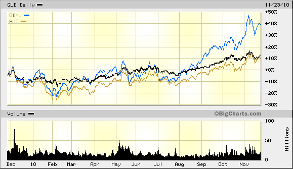 Das berühmte Beipiel von Homestake haben wir öfter hier erwähnt, selbst in den 70er/ 80er Jahren sind viele Minen förmlich explodiert. Nicht der HUI, den es ja nicht zu lange gibt, er repräsentiert sowieso nur die hochkapitalisierten, schwergewichtigen Aktien, die auch jetzt den kleinen Juniors weit hinterherhinken, sh.1 Jahres Chart.