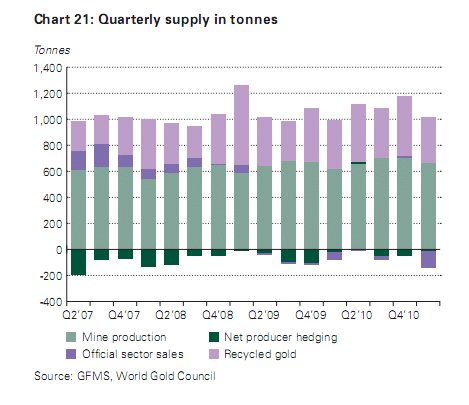 "...Die weltweite Nachfrage nach Gold erhöhte sich im ersten Quartal verglichen mit dem Vorjahreswert um 11% auf 981,3 Tonnen. Im Vergleich zu den 1.003,7 Tonnen vierten Quartal 2010 verringerte sich die Nachfrage leicht. Der Dollar-Wert der Goldnachfrage stieg im ersten Quartal im Vergleich zum ersten Quartal des vergangenen Jahres um knapp 40% auf 43,7 Mrd. USD...."