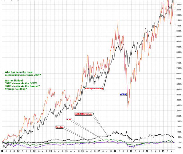 Ich vermute mal dass bei diesem Chart davon ausgegangen wurde, dass der "durchschnittliche EM-Bug" nicht nur Münzen und Barren, sondern auch EM-Aktien hält. Dann wären 1300% auch durchaus realistisch. Allerdings bezweifle ich dass viele Goldbugs 2001 schon Minenaktien gekauft haben.