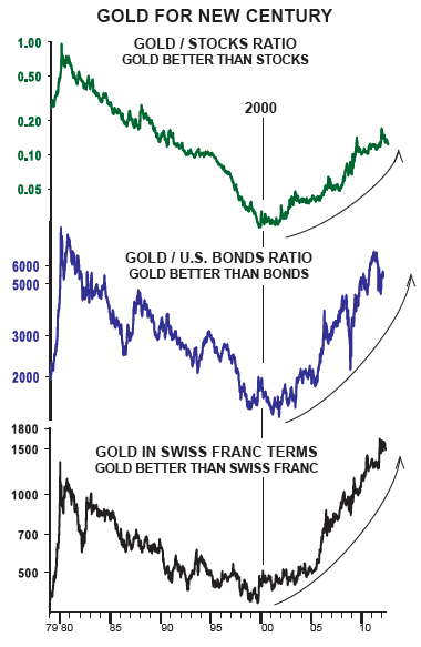 Ein Chart, der die Überlegenheit des Goldes ab 2000 vs Aktien, US Bonds und dem SFR zeigt.