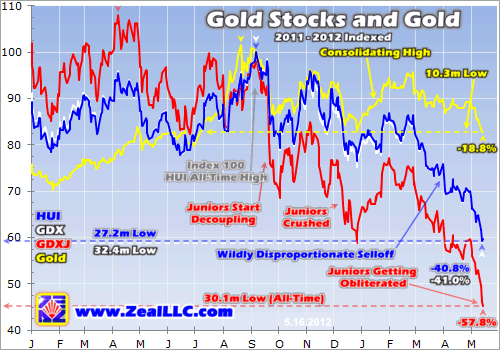 ZitatIn diesem Monat wurden die Goldaktien gnadenlos in Stücke gerissen, ihr Preisverlauf glich einer Apokalypse. Der dadurch verursachte, enorme psychische Stress hat auch die letzten Haussiers in diesem Sektor ergriffen. Ihre Verkäufe führten diese Woche zu einer ausgewachsenen Kapitulation, was zahllose Investoren dazu veranlasste, das Handtuch zu werfen. Derartige Ereignisse sind kennzeichnend für ein entscheidendes, langfristiges Tief.