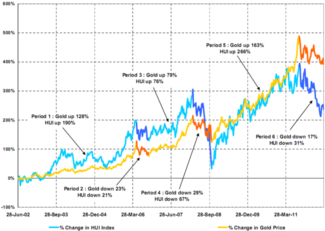 Q.E.D„ Angesichts der Gesamtentwicklung, liegt es laut den Analysten Paul Burchell und Vanessa Gravina nahe, eine Investition in das gelbe Metall anstatt in die Produzenten zu empfehlen. Genauer betrachtet könnte man allerdings schlussfolgern, dass die Produzenten das Metall in Zeiten des Goldpreisanstieges deutlich übertreffen (siehe Periode 1 und 5 im Chart) .
