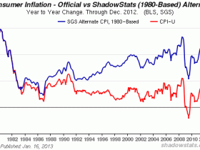 Seine vorgeblich korrekten 2308 $ sind hypothetisch und beruhen auf der eindeutig manipulierten US Statistik, hier oftmals aufgezeigt. Deshalb angehängt die CPI -- offiziell und nach Shadowstats.-- Dies hatte ich ausführlicher hier abgehandelt:„US Inflation : 9 - 10 % statt offizieller 2,5 %