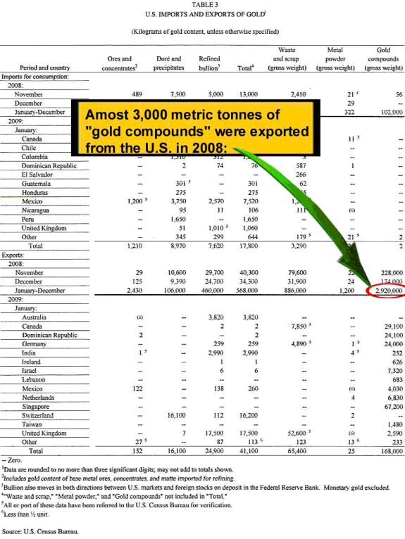 Die USA exportierten innerhalb von zwei Jahren mehr Gold als weltweit produziert wurde: 22 Millionen Unzen an veredeltem Gold und mehr als 154 Millionen Unzen Mischgold in den Jahren 2007 und 2008. Das entspricht 62 Prozent der angeblich vorhandenen gesamten US-Goldvorräte und mehr als dem Vierzehnfachen der gesamten US-Goldminenförderung in diesen beiden Jahren zusammen genommen. Wo kam das ganze Gold her?“