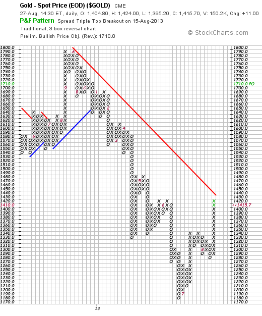 I'm posting GDXJ (speculative gold miners) just for good measure. Here we see a bullish formation on the P&F chart. The P&F projection target is 65, which allows for a huge rally from here....“