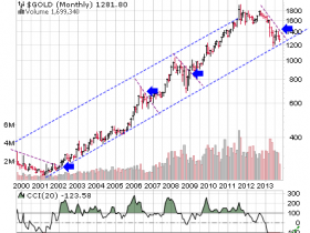 Da fällt mir ein, daß er bereits vor 10 Jahren ein Ratio Gold : Dow etwa 1:1, jeweils etwa um 3000, für wahrscheinlich hielt; Hierbei liegt er allerdings stark daneben. Diese Prognose braucht aber nicht so völlig absurd sein und könnte in einer Exponentialphase des Goldpreises bei Dollarkollaps und Absturz der Standardaktien einmal eintreten.