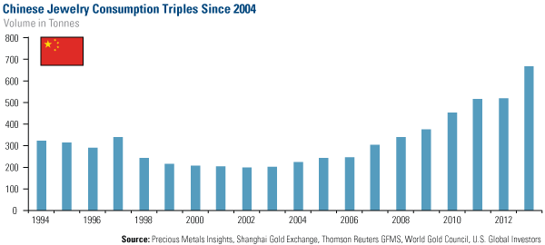 „...Over the last 10 years however, a new middle class has emerged and consumers have been enjoying their new wealth. As GDP began to rise, people started buying more gold jewelry and coins. In addition to increased spending on these items, the investment demand for the yellow metal progressed as the population sought a hedge against inflation....