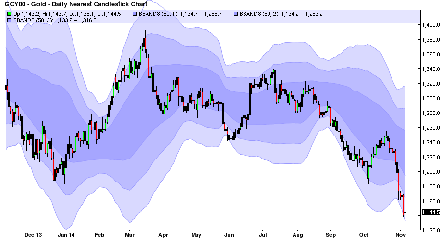 „..Gold is trading more then 3 standard deviations away from its 50 day mean yesterday. This is a very rare event, especially when Bollinger Bands are wide. It should be considered an extremely oversold condition, and judging by history it is from where powerful rebounds and mean reversions tend to occur....Now the prices are sinking even lower towards $1100 per ounce, so buying Gold has gone from a very good entry towards a great entry. If it gets down to $1000 per ounce, it will be a magnificent entry. The lower it goes over the coming weeks and months, the better your return will be in coming years!...“