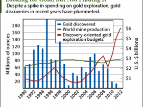 Die Entdeckung neuer Goldvorkommen sinkt dramatisch, zudem werden die Aufwendungen immer kostspieliger, Erschließungen dauern länger :