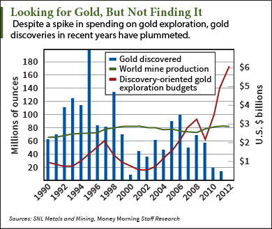 Die Entdeckung neuer Goldvorkommen sinkt dramatisch, zudem werden die Aufwendungen immer kostspieliger, Erschließungen dauern länger :