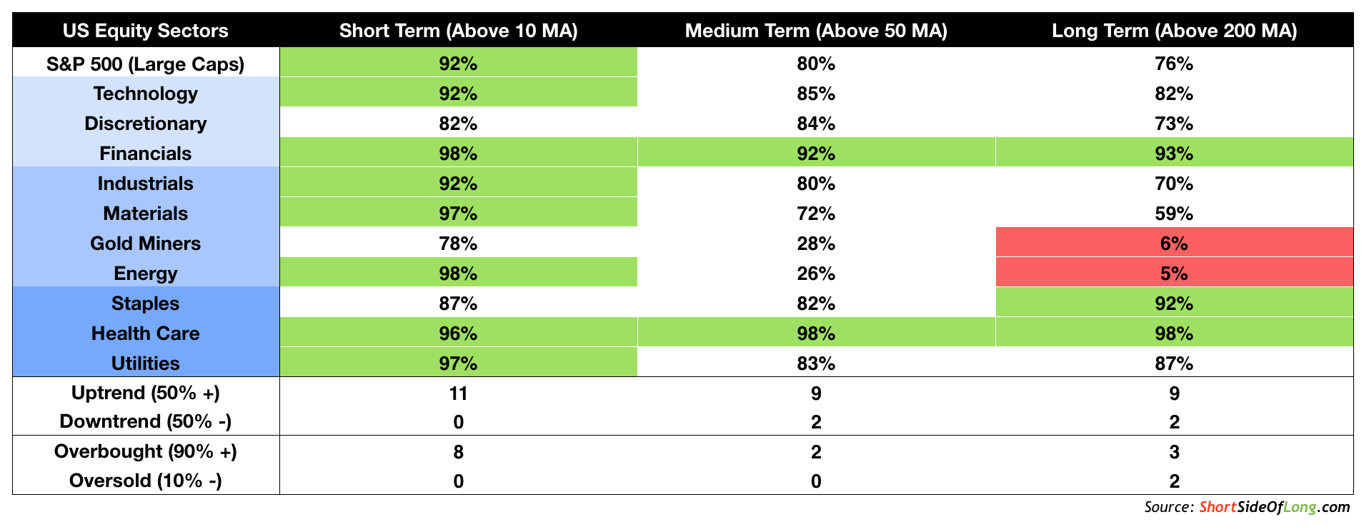 Gute Übersicht von Tiho Brkan, der einige Marktsektoren über verschiedene MAs vergleicht. Dabei liegen nur 6 bzw 5 % über der wichtigen 200 MA.