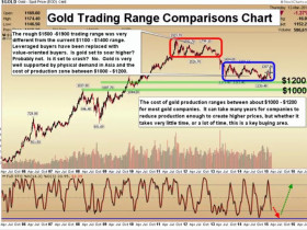 Dazu passend ein Chart von Morris Hubbartt, sh. auch dessen Anmerkungen in den Kästchen. Die Produktionskosten sind zwar nicht signifikant entscheidend für den Goldpreis, jedoch ist langfristig der Goldpreis nicht unter diese Kosten gefallen.