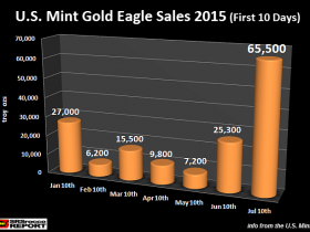 Something quite interesting took place on Friday last week. The U.S. Mint updated its figures showing sales of its Gold Eagles surged to a level not seen for more than a year. Sales of Gold Eagles have been strong ever since the financial turmoil in Europe increased significantly with the threat of a Greek Exit.