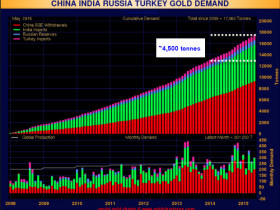 Hier aus dem riesigen Text mit vielen Charts herausgepickt die US Veschuldung, die 3 x schneller als das BSP steigt, sowie die Goldnachfrage von China, Indien, Rußland und Türkei zusammen, die ab 2014 allein 4 500 t Gold konsumierten. Auich interessant, daß aus London LBMA in etwas über einem Jahr 2750 t ausflossen..
