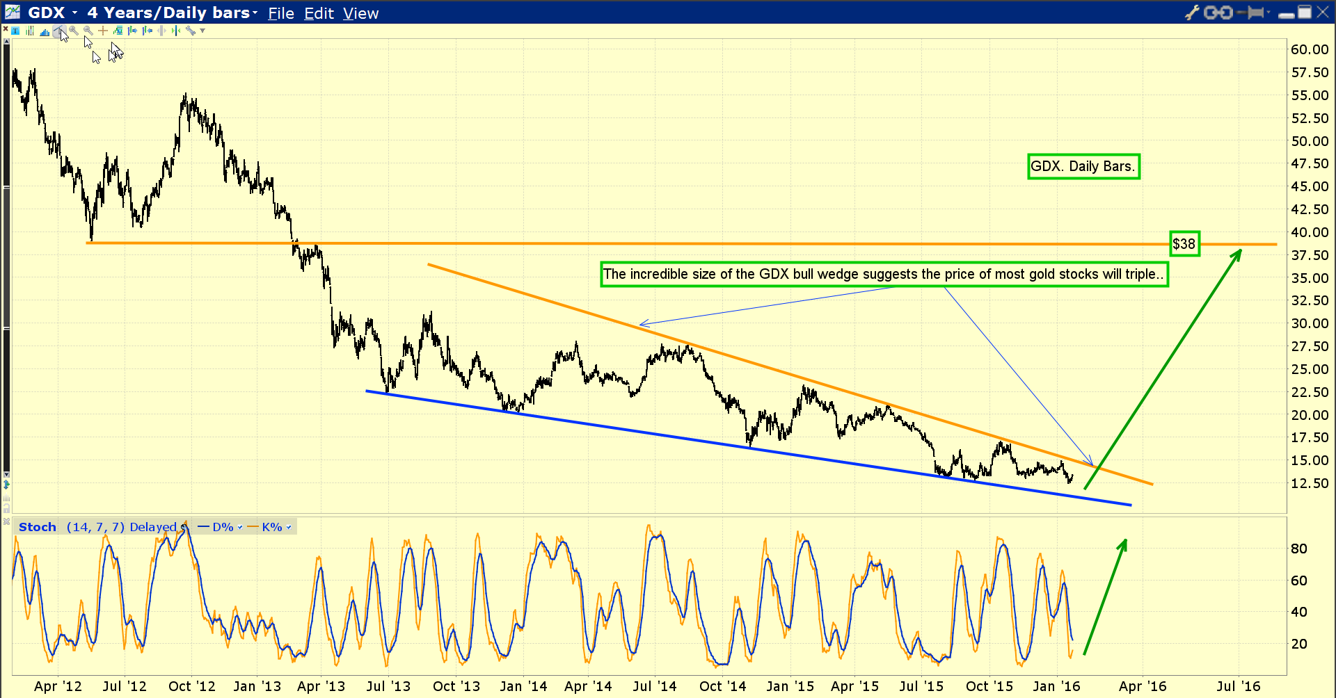 „The massive bull wedge pattern in play suggests than an “institutional awakening” is at hand for the gold stocks sector, as the oil supply glut and Janet’s rate hikes send global stock markets into a financial gulag. I’ll dare to suggest that equity-oriented money managers are soon going to view gold stocks as asset class champagne!.."