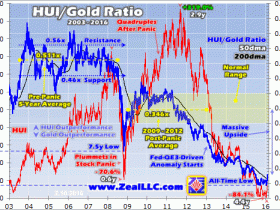Bei einem Goldpreis von 1.200 Dollar und einem durchschnittlichen HUI/Gold-Verhältnis von 0,346 liegt das Kursziel des HUI bei 415 Punkten. Ausgehend vom Schlussstand des Kurses am Mittwoch entspräche das einem Anstieg um 179% und würde bedeuten, dass sich der Kurs gegenüber den absurden Tiefstständen der jüngeren Vergangenheit mehr als vervierfacht...