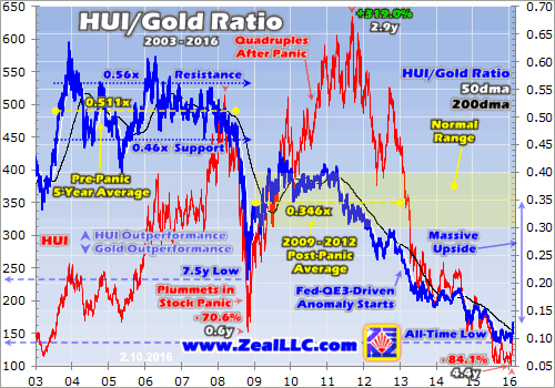 Sehenswert allemal die Kostenrechnungen und Vergleiche zu früheren Paritäten, gute Grafiken. Angehängt die extremen Bewegungen beim HUI : Gold Ratio.